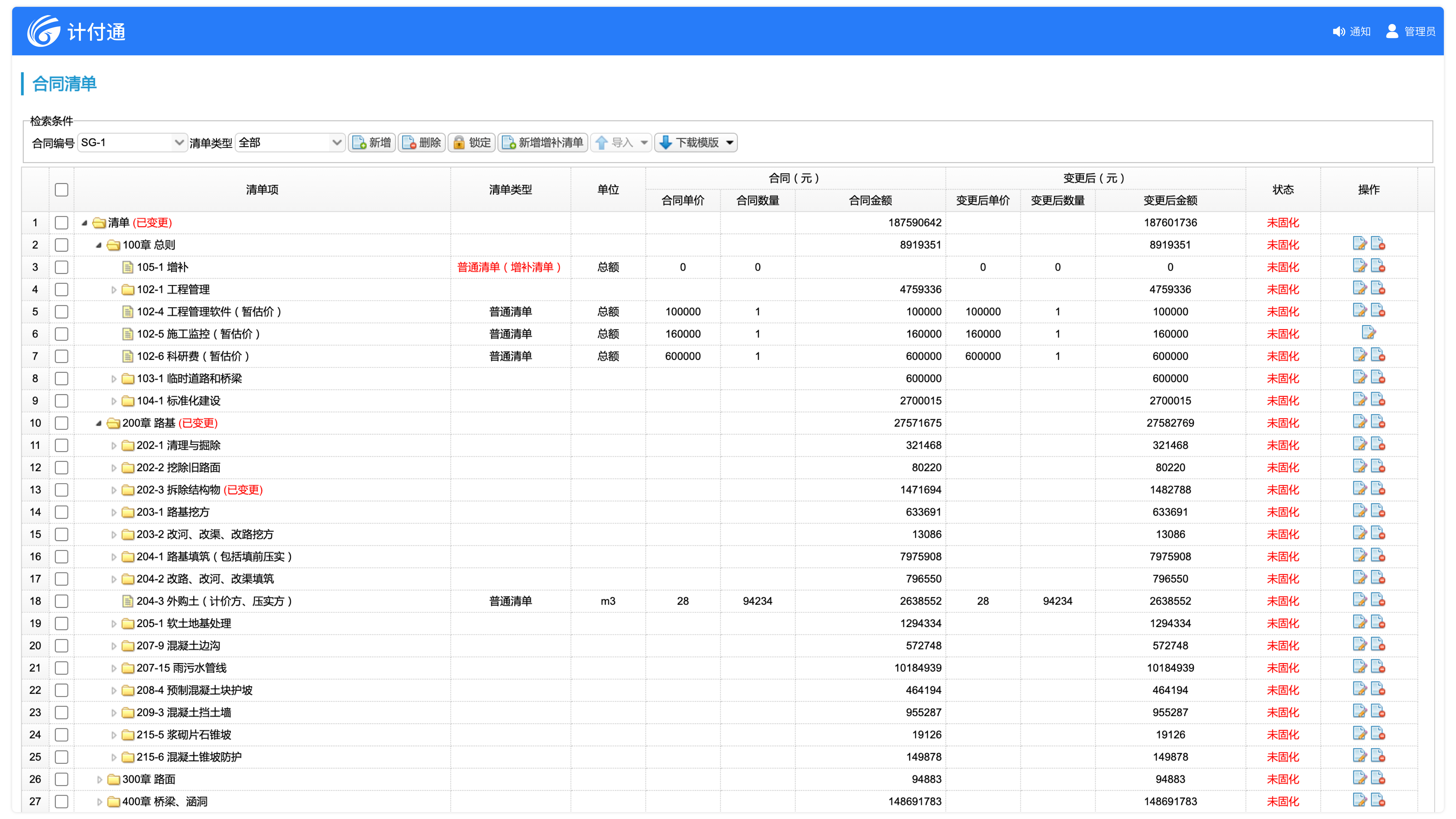 合同清單支持公路、房建、市政、水運(yùn)、航道等不同項(xiàng)目類型的工程量清單,提供標(biāo)準(zhǔn)模板,支持清單導(dǎo)入導(dǎo)出。